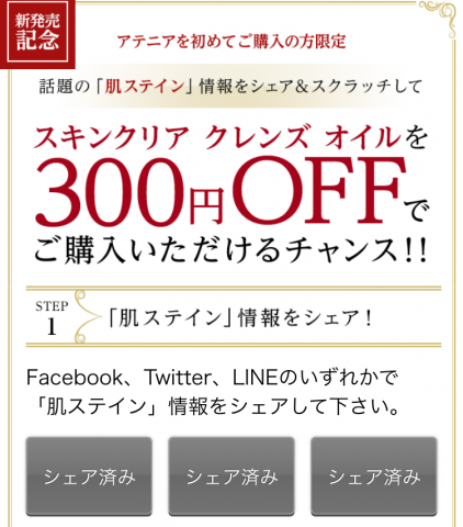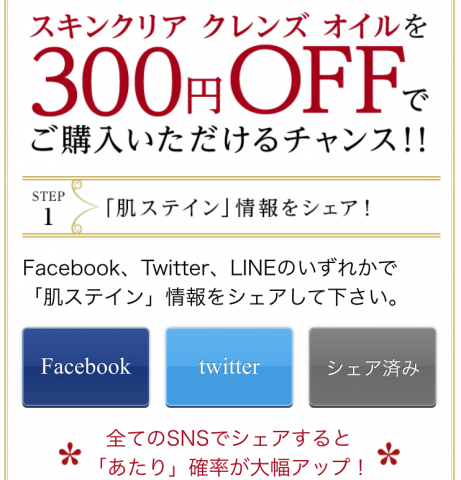 キャンペーンのルールによると、このシェアボタンを使って、スキンクリアクレンズオイルについてシェアしてからスクラッチすると、あたりの300円OFFが出やすくなるということになっています。